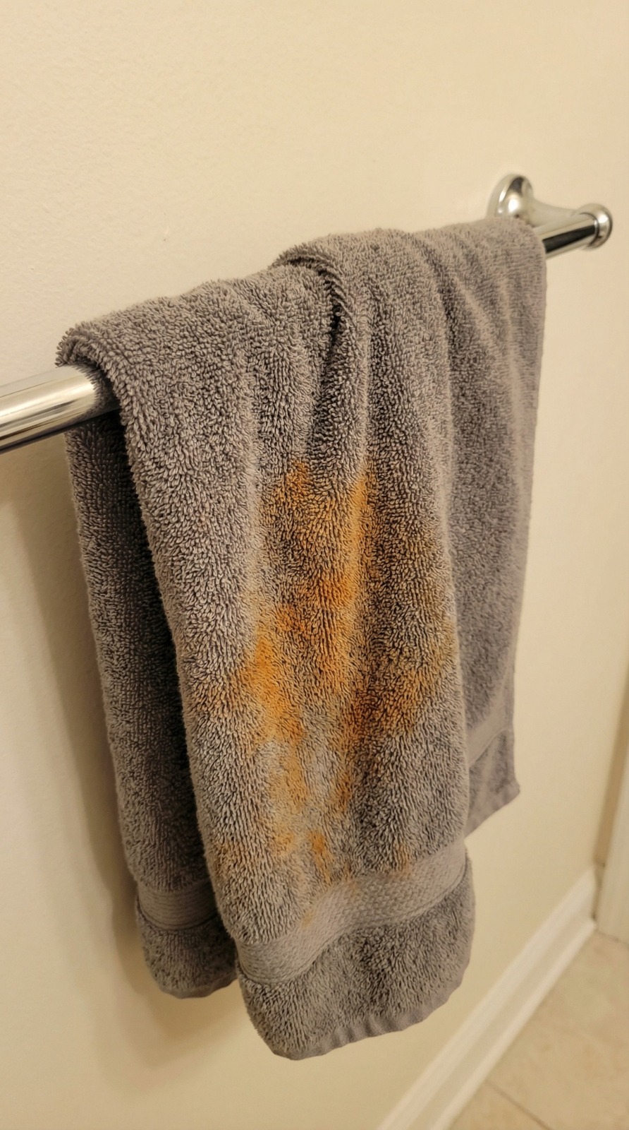 - Stains appear even on clean towels